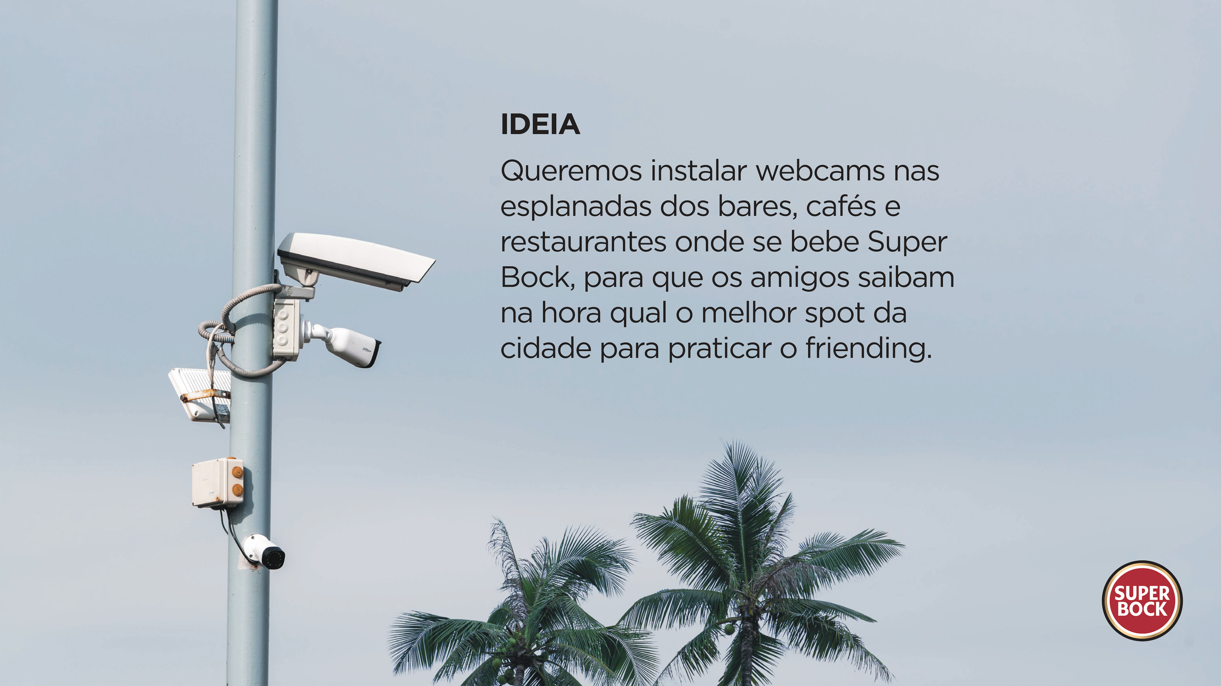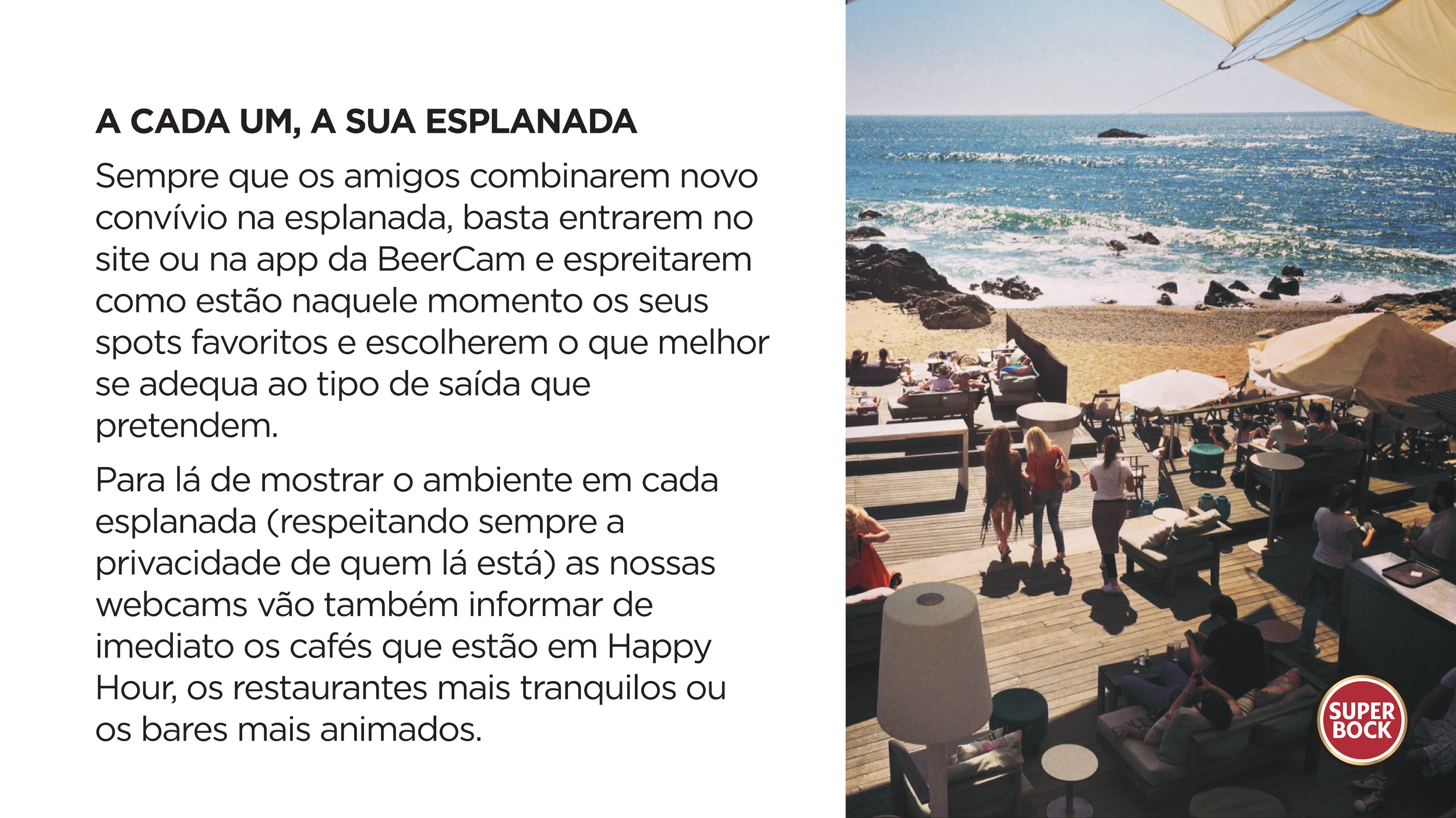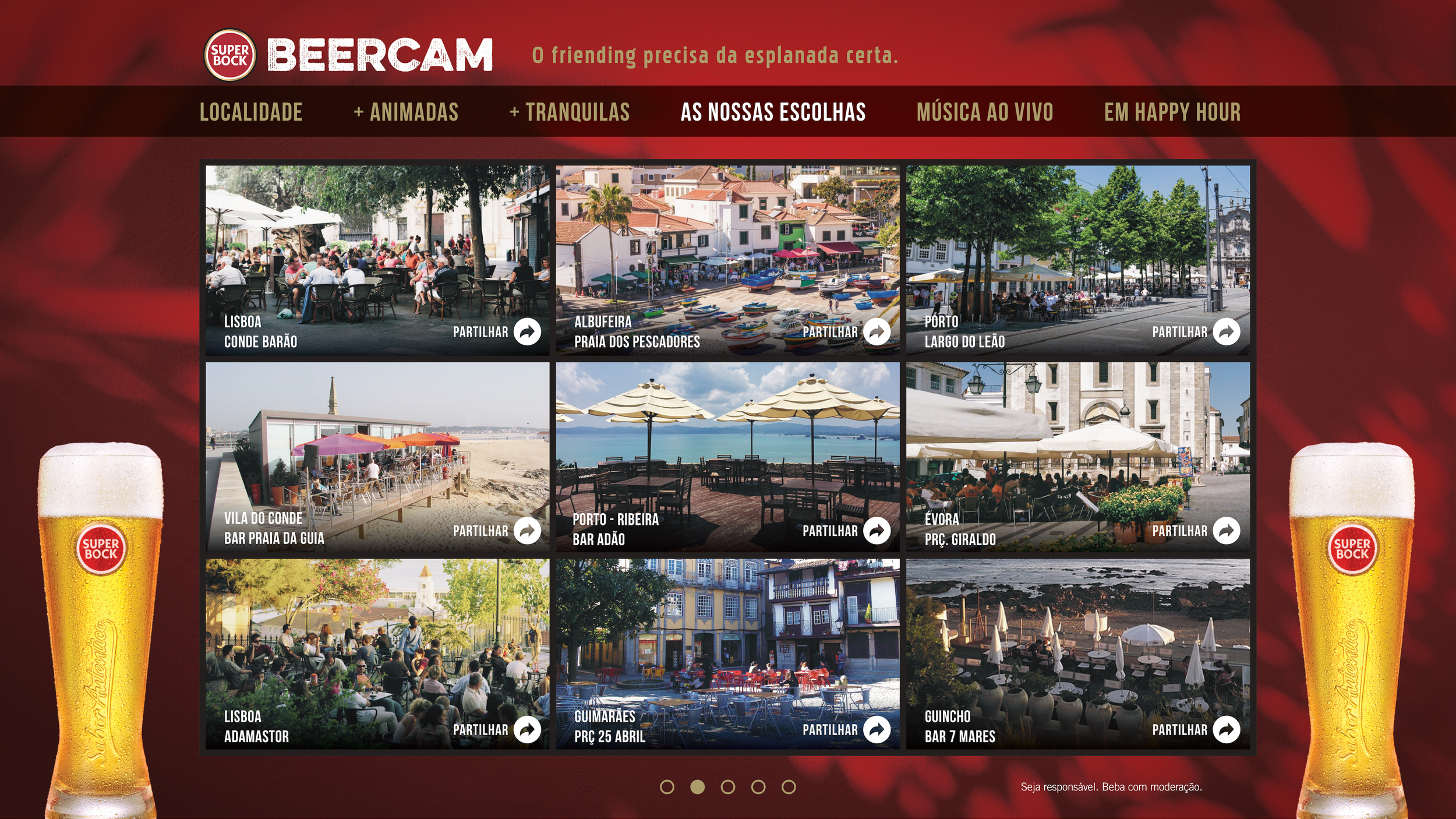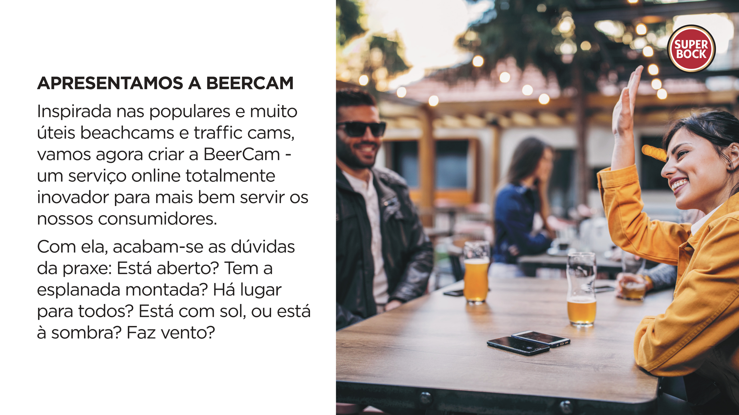 Com uma webcam em cada esplanada, os amigos vão saber sempre onde encontrar o spot ideal para praticar a amizade. Depois da beachcam, da weathercam e da trafficam, chega agora a Beercam da Super Bock.