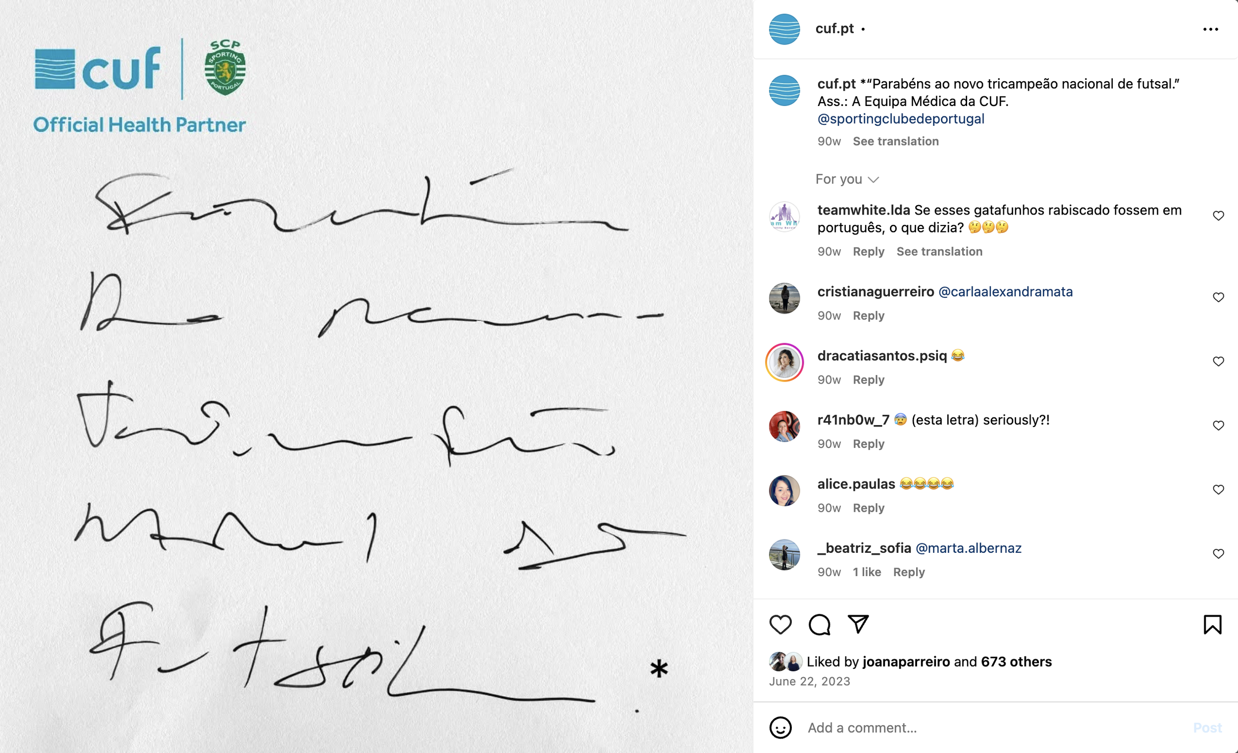 Um post a celebrar o tricampeonato nacional de futsal do Sporting, escrito pela mão do corpo médico da CUF.