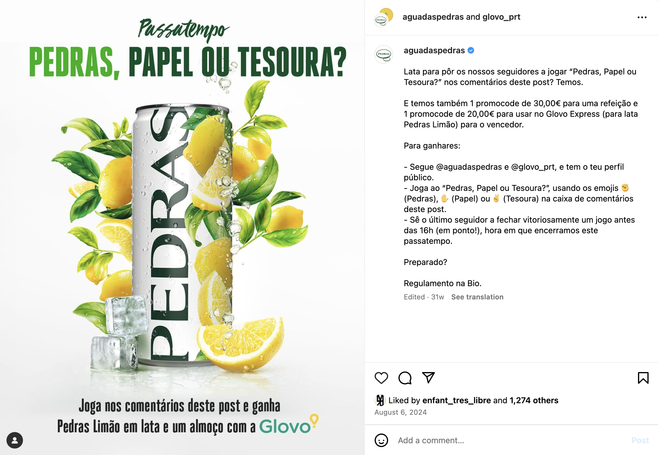 Um post onde se jogou ao ✊, ✋ ou ✌️ na caixa de comentários do Instagram da Água das Pedras.